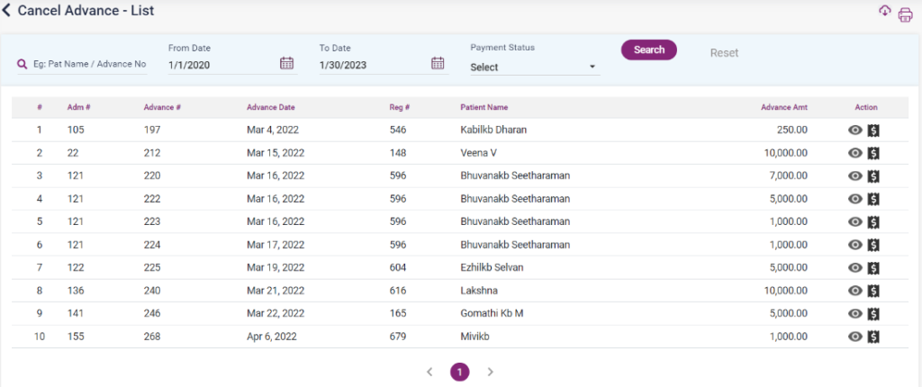 - If the advance paid for a particular IP patient has to be returned or canceled, it will be shown here.