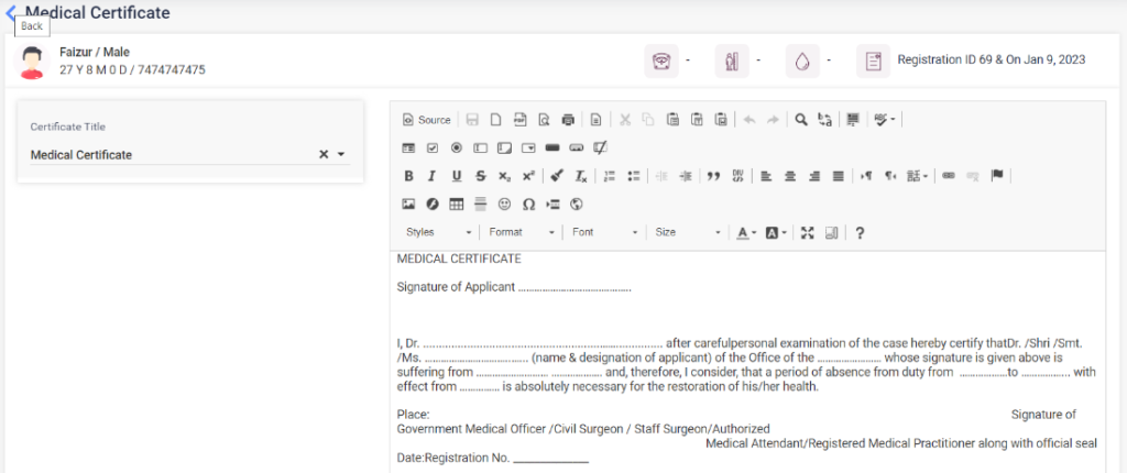 The certificate section of the patient list option is available to select the medical certificate and Consent form. These certificates can be created by entering the details in the loaded certificate.