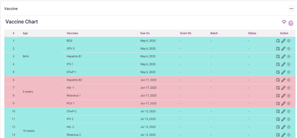 This can be loaded if the patient is a pediatric. On opening Vaccine chart tab, it asks to “Confirm”. Once the user clicks the “Confirm” button, the vaccine chart for a child from birth till age 12 will be loaded.
