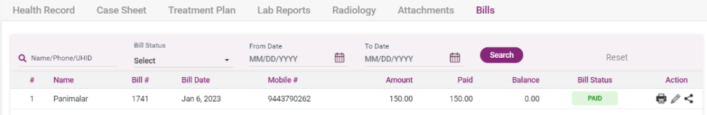 This section of the EHR contains all the bills paid by the patient. The bills can be searched by date, name and status. After search the bills will be displayed as a list in the page. The user can edit, print and share the bills of the patient.