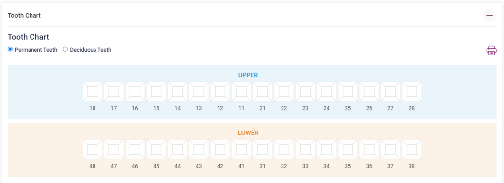 • Tooth chart: The number of Permanent teeth and deciduous teeth will be displayed as an image. The user can click on each tooth and enter the details of the tooth position, add color to the decayed part of the teeth according to the severity.