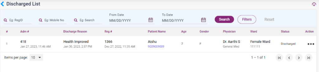 - The discharged patient details can be searched by reg ID, Mobile number, from and to date, search field and discharge reason.