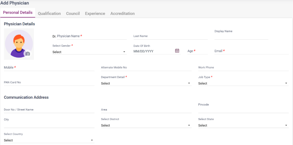 - Fill in the physician’s personal details, Qualifications, Council, Council, Experience, and Accreditation details.