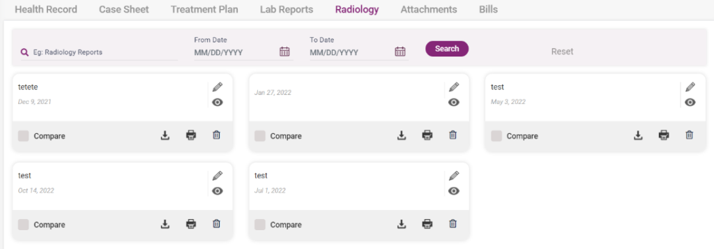 This section contains the patient’s lab reports, which were taken and completed. The user can View, Share and Download the patient’s lab reports.