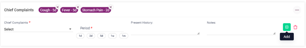 2. Chief Complaints- In this section, select the patient’s chief complaint from the drop-down list and select the period. Enter the present history and notes if needed. Click on the “Add” button on the right, and the chief complaint entered will be saved and displayed on the top. Click on the added chief complaint to edit or delete it.