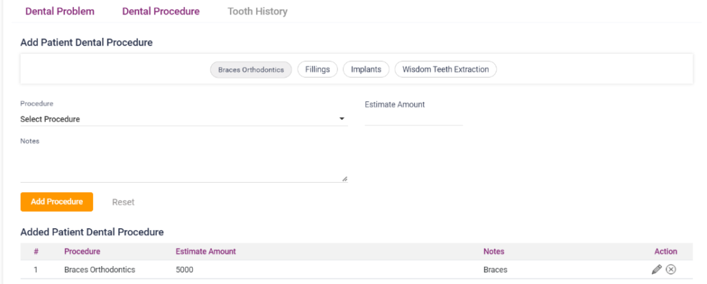 - Dental Procedure: Select the procedure from the drop-down list, and enter notes, if any. The estimated amount will be displayed automatically. Select the “Add Procedure” button to display the added dental procedure in the list below. Click on the Reset button to delete the entered details. The user can edit or delete the added procedures using the “Edit” and “Delete” icons.