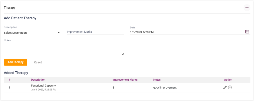 7. Therapy- The user can select the therapy from the drop-down list, enter the improvement marks and add notes, if any. The current date and time will be automatically displayed in the “Date” field. Click the “Add Therapy” button to display the therapy added to the list below. Click on the “Reset” button to delete the entered details.