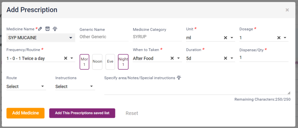 - Add Medicine: Click the “Add Medicine” button to add the medicine to the prescription list.