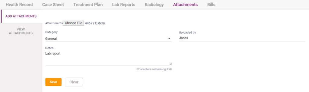 In this section, the user can attach any file which belongs to the patient. It may include lab, radiology, general consultation, prescription, or any file type.