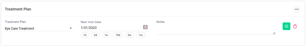 12. Treatment Plan- Select the patient’s treatment plan from the drop-down list, select the next visit date, and add notes, if any. Click on the “Add” button on the right, and the treatment plan entered will be saved and displayed on the top. Click on the added chief complaint to edit or delete it.