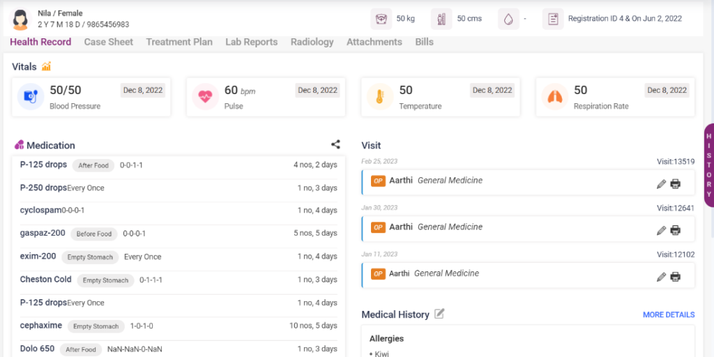 - Vitals- Recent vitals, including BP, pulse, temperature, and respiration rate of the patient, were taken recently. On clicking each of the vitals the graph of the particular vital will be displayed in a pop-up box.