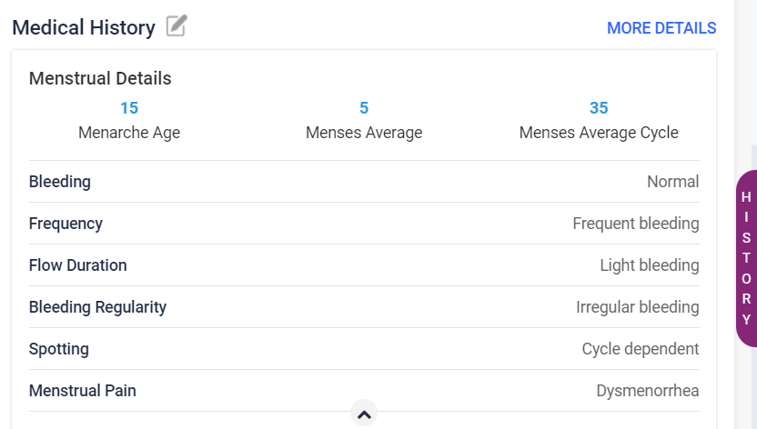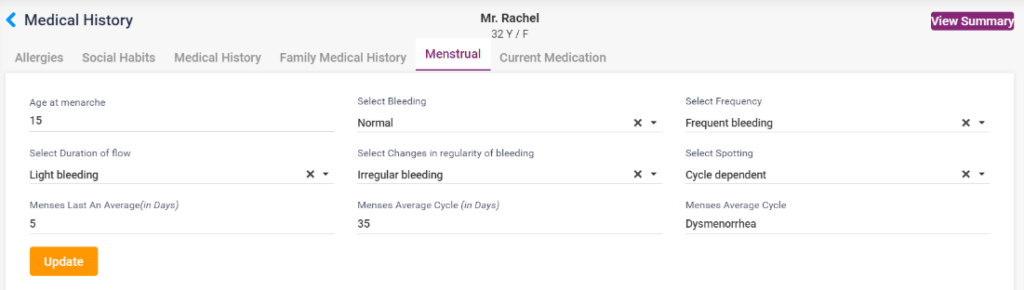 - Menstrual – The details include, age at Menarche, type of bleeding, frequency, duration of flow, changes in bleeding, spotting, number of mensus days, number of mensus cycle days, mensus average cycle. Enter the details and click on the “Save” button. The entered details can be edited and updated.
