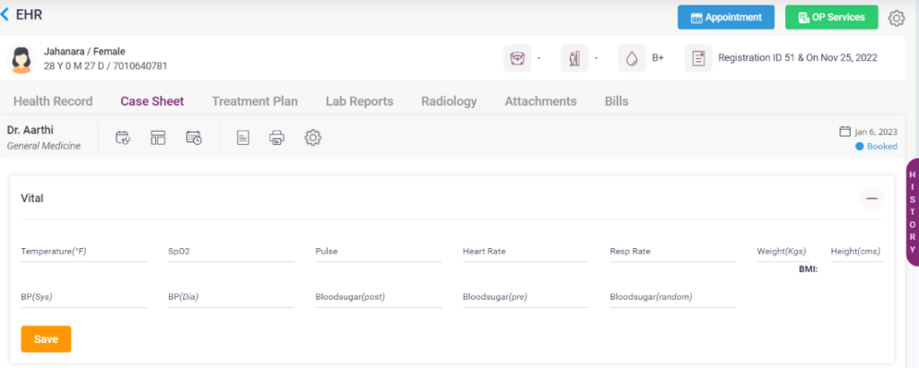 1.Vitals- The vitals section includes, Temperature, BP(systolic and diastolic), pulse, Respiration rate, heart rate, blood sugar(pre, post and random), SPO2, Weight and height. After entering these data the user can click “Save” button.