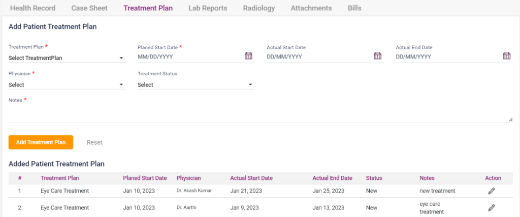 - Add Treatment Plan: Select the “Add Treatment Plan” button to display the added treatment plan in a list below.