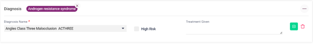 5.Diagnosis- The user can select the diagnosis from the diagnosis name drop down list, select high risk check box if the diagnosis is critical. Enter the treatment given in the field if needed. Click on the “Add” button to display the diagnosis added. Click on the added diagnosis to edit or delete it.