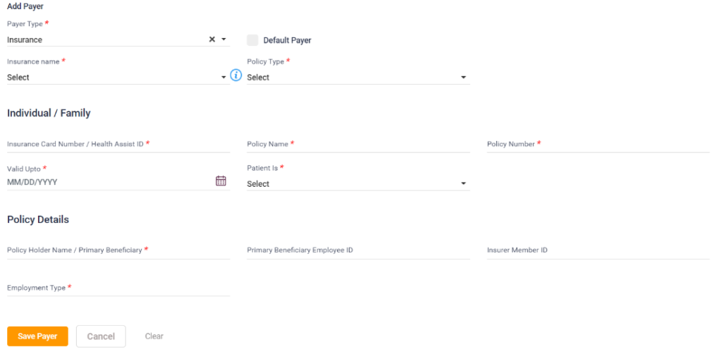 - Save Payer button: After entering the details as mentioned above, Click on the Save button to save the details. After the details are saved, the payer’s name will be displayed in the list under the Insurance tab.
