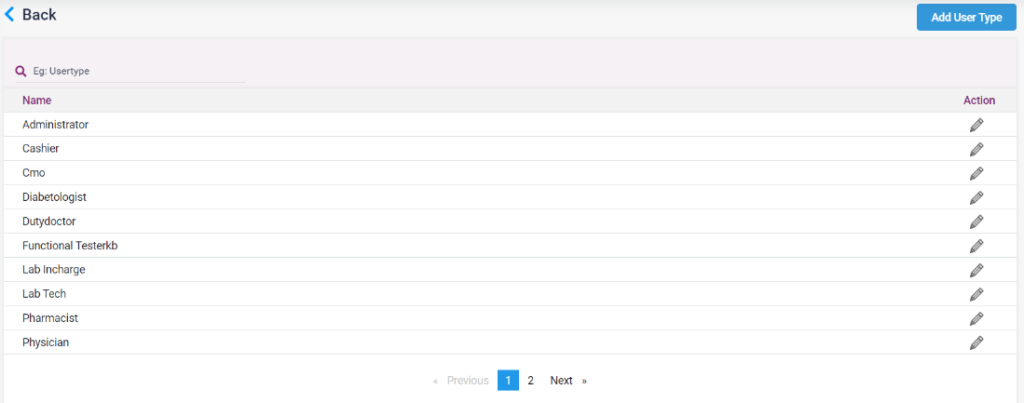 - Click on “Save” button. The added user type can be edited using the edit icon.