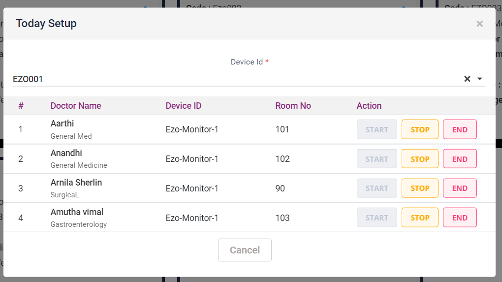 - Today’s setup: Click on the today’s setup, select the device Id from the list. Select start, stop or end accordingly.