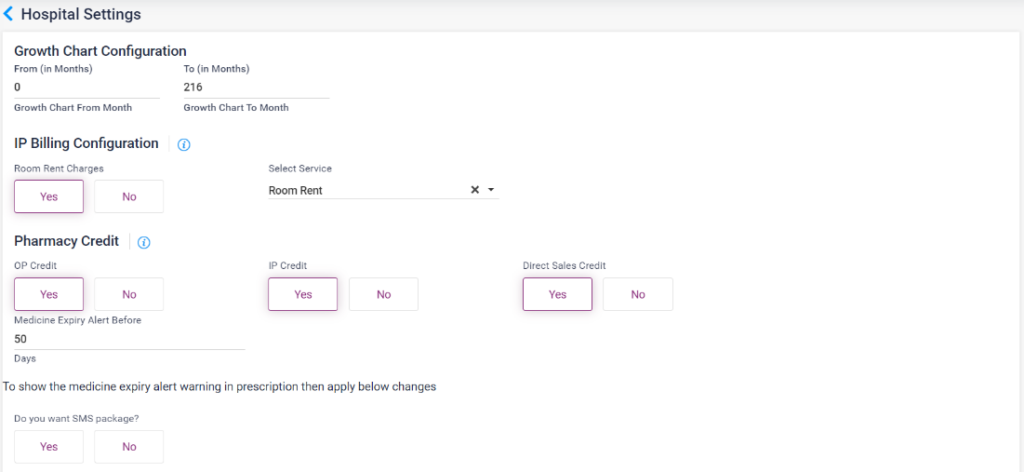 - Pharmacy Credit: Select yes or no for the OP, IP, Sales bills credit bills.