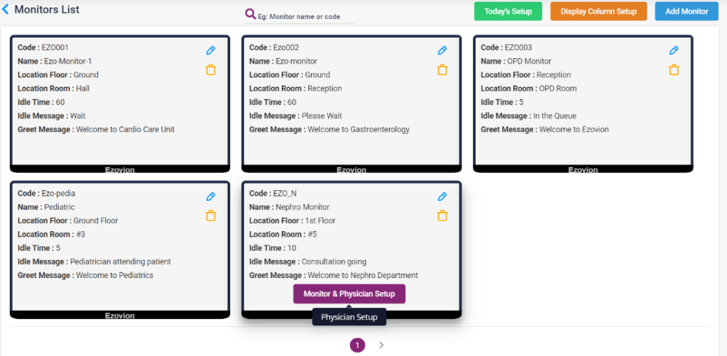 - Click on the “Add monitor” button to add the monitor for different doctors or departments. Enter the code, name, location, idle message and click on “Save”. The added monitors will be displayed in the screen.