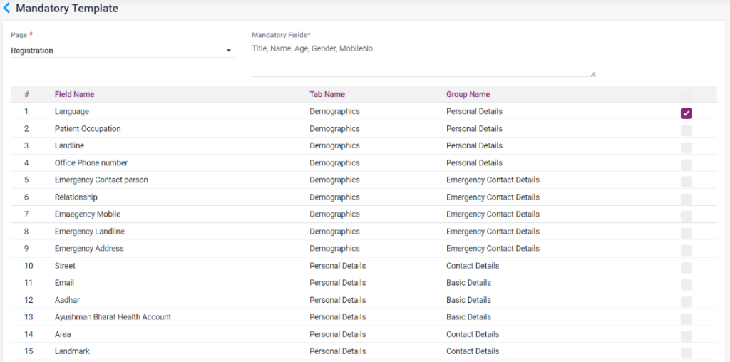 - Mandatory settings: The mandatory field settings i.e., the mandatory fields for the registration page, IP admission page and doctor registration page can be set up here.