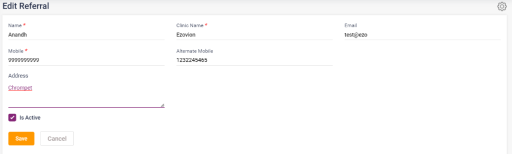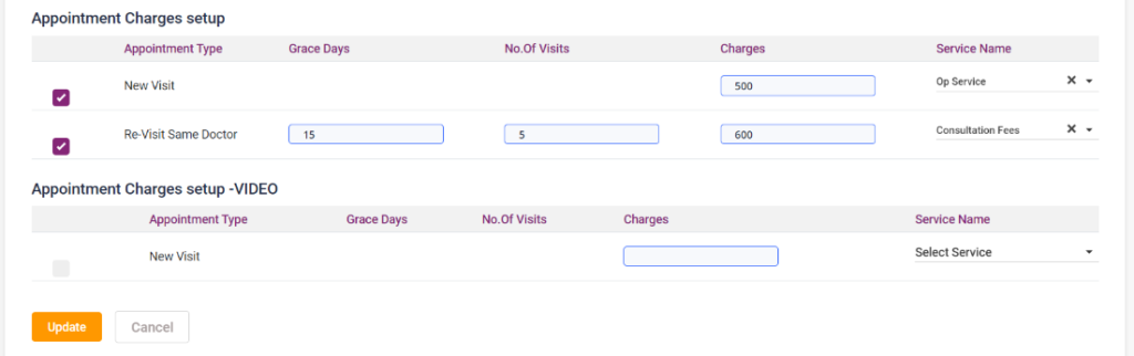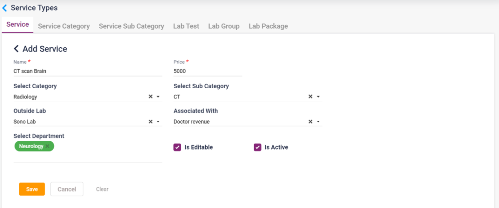 - Service: Under service, click on “Add Service” button. Enter the service name and price, Select the category and sub category, select the department, select the referral detail whether the service is associated with patient referral, doctor revenue or no sharing. Check the Is active checkbox, Is Editable check box accordingly and click on save.