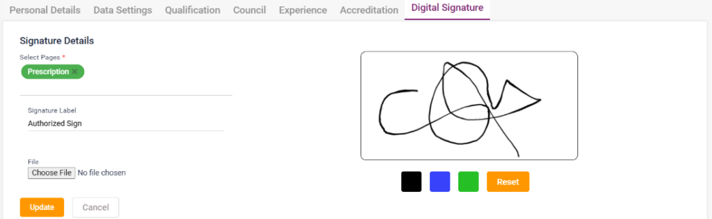 - Select the report header tab, select the header logo, enter the hospital details, contact details and set up the header height, line height, select the font family, background color and font color. Click on the update button