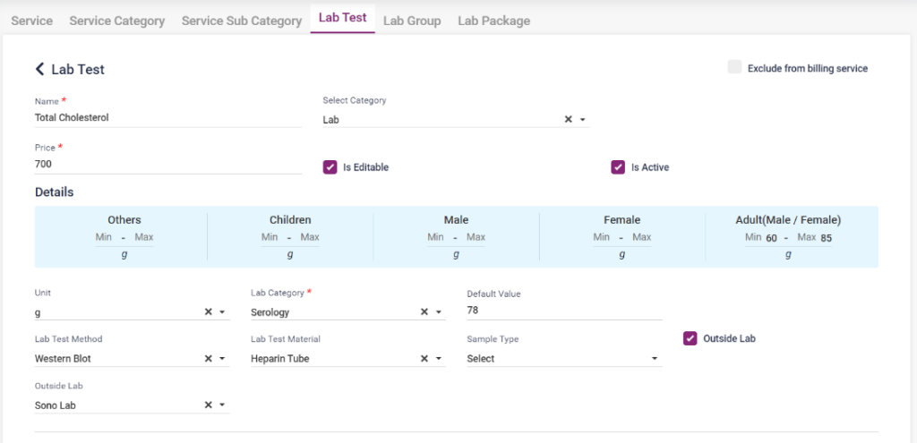 - Service: The lab services can be created here. Add the service category and service sub category then add service in the Service page. Add the lab tests in the lab test page. Add lab group and lab package for lab tests.
