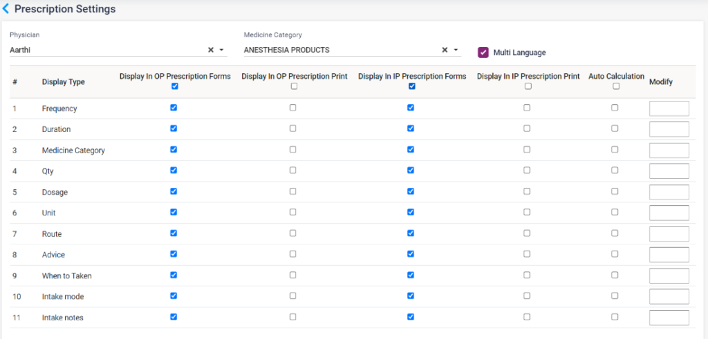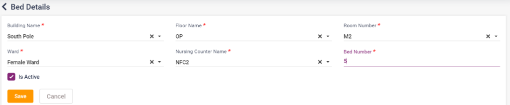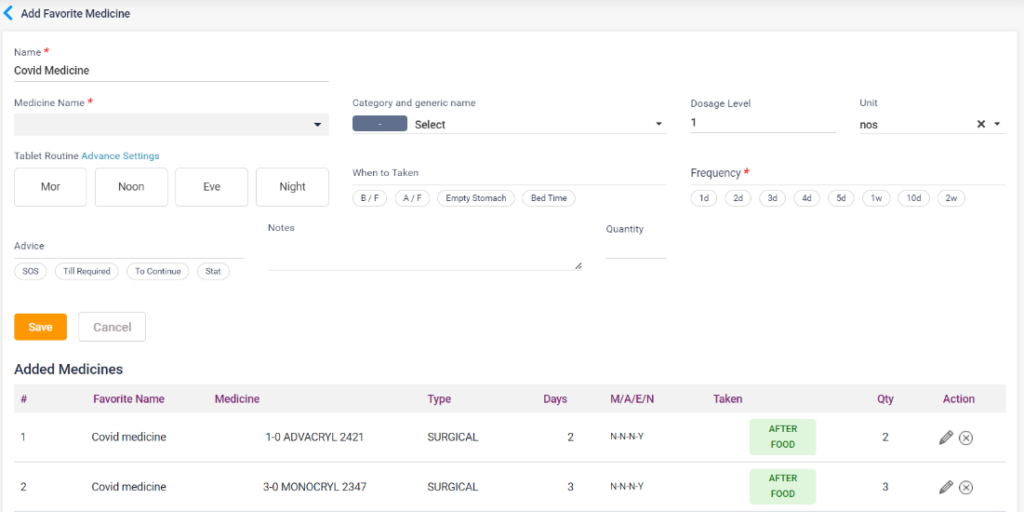 - Unit: The unit measurement for medicines or patient food intake has to be set up here.