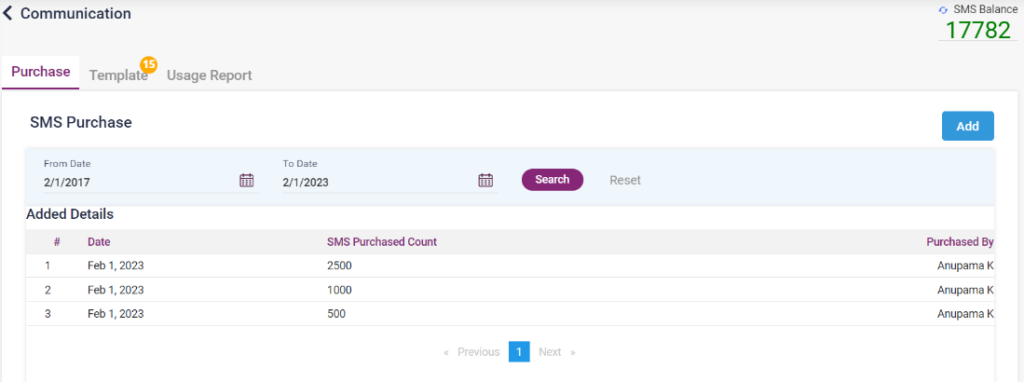 - Under Purchase, click on the “Add” button and choose the number of SMS needed to purchase.