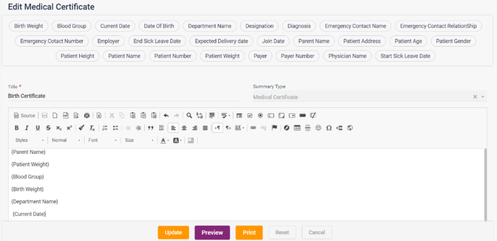 - Create a medical certificate according to the needs of the patient or the template of the hospital.