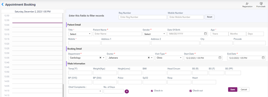 - Reg Number: Enter the register number of the old patient and click on enter to load the details of that patient.