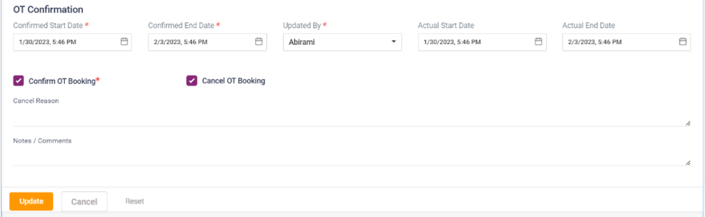 •  If the OT has been cancelled, select the cancel OT booking checkbox, enter the reason and select the “Update” button.