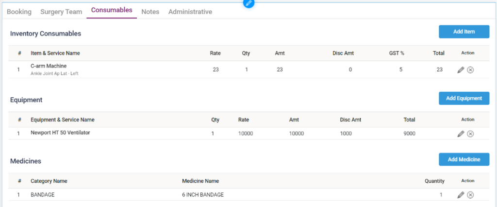 • Inventory Consumables: Click on the “Add Item” button and select the items needed for the OT surgery.