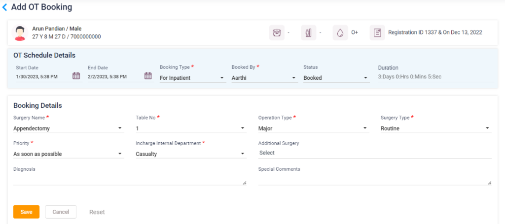 • Cancel and Reset: Select cancel to cancel the OT Booking and reset to clear the entered details.