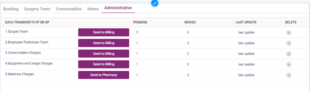 Once all the steps mentioned above are completed, the physician consultation details, the employees involved in the OT,  surgery fee details, the equipment used, and the medicines needed, all of these details will be sent to the IP Billing section of the IP Admission List. The billing should be done from there, and the OT must be updated as Completed.
