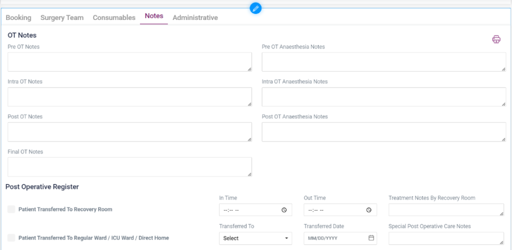 • OT Notes: Enter the following notes if needed. Pre OT Notes, Pre OT Anesthesia Notes, Intra OT Notes, Intra OT Anesthesia Notes, Post OT Notes, Post OT Anesthesia Notes, Final OT Notes.
