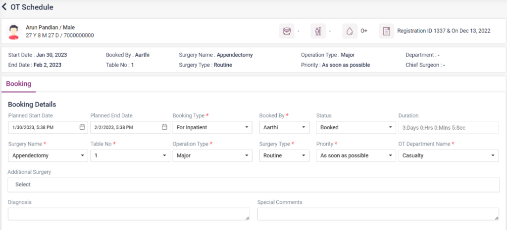 • Booking Details- Select the surgery name, table no, operation type, surgery type, priority and Internal incharge department. The fields mentioned above are mandatory.