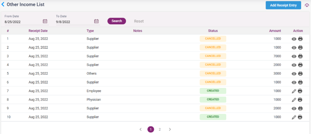 • This page consists of the income for the hospital by any other means. It can be entered manually by clicking on the “Add Receipt Entry” button.