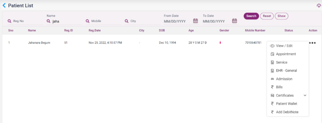 The patient list contains the list of patients registered in the Ezovion HMS. It also contains the details of the patients, such as Name, Reg ID, Registered Date, City, DOB, age, gender, mobile number, and status. From this page, the user can navigate to the following pages via the “Action” option present.