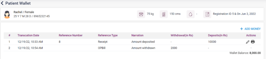 After the payment is made, the details of the amount will be loaded as a list in the “Patient Wallet” screen. The user can make multiple payments for the patient. The payment can be edited and taken print by clicking the icons available. The available wallet balance will be shown below.