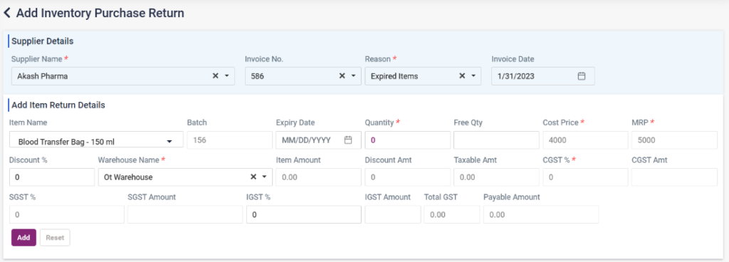 ii. Purchase Return: If the products purchased are damaged, expired, ordered by mistake or for any other reasons, then those particular products can be returned to the distributor. The purchased list can be searched using the from date, To date or Period, supplier name and reason. Using the following steps,