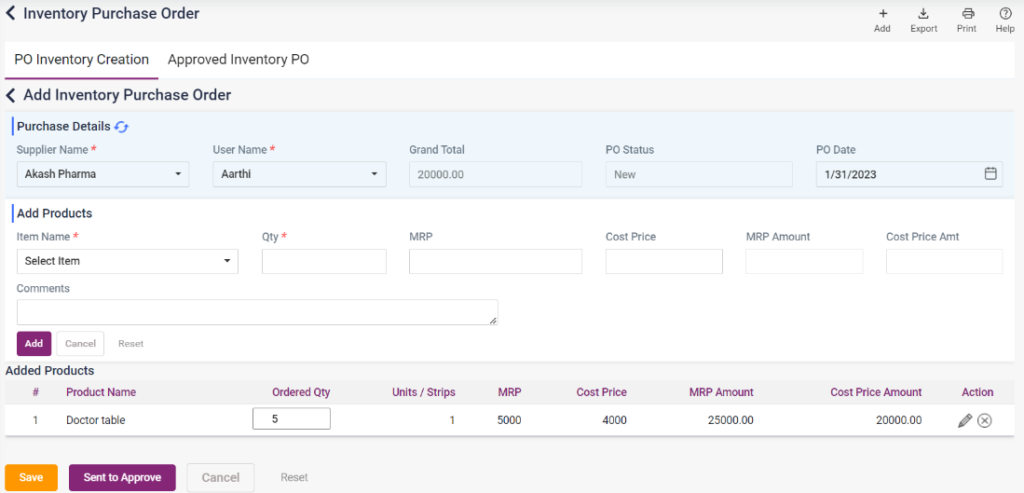 • Suppose the net Amount and Invoice amount match, the purchase approval pop-up box appears on clicking save. The user must click the “Approve” button to approve the purchase and list it in the Inventory Purchase screen. The status will be displayed as “Approved”.