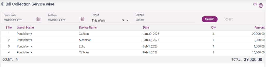 1. Bill Collection Service Wise: This report displays the list of services provided along with the service name and date the service was provided.