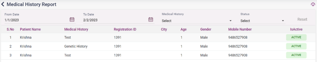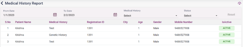 1. Medical History Report: This page shows the patient’s medical history in the system.