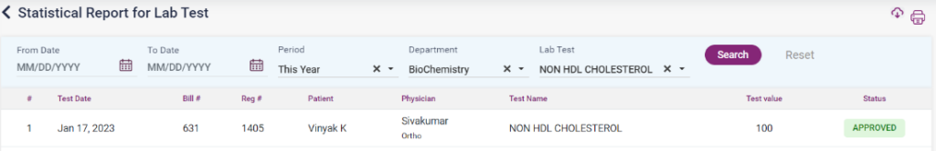 1. Statistic report: The report shows the list of the patient’s test names and test values, along with the physician’s name.