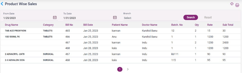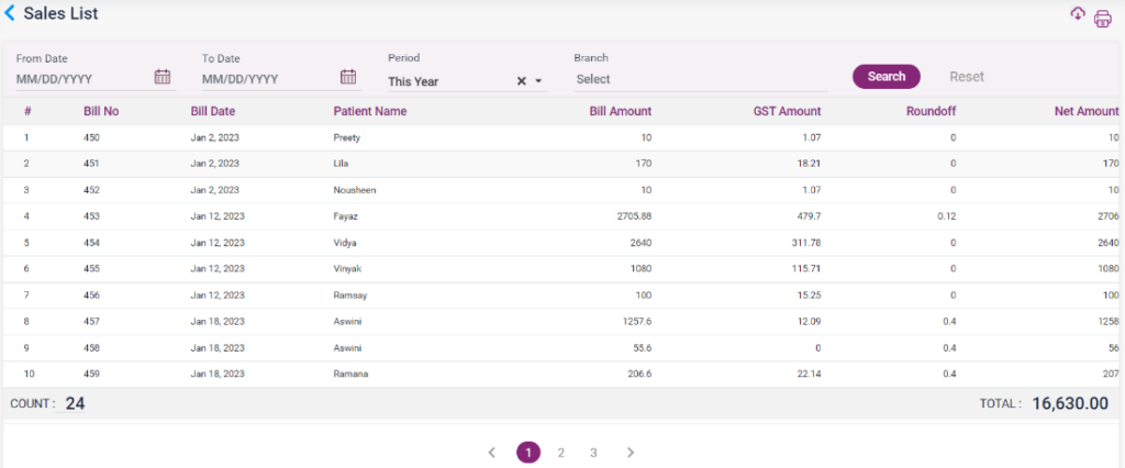 1. Sales list: The list of sales that happened from the pharmacy, along with the bill details, patient name, and the amount, will be displayed in this report.