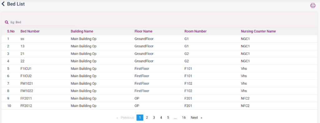 1. Bed List: This report shows the list of beds, along with the bed number, building name, room number, floor, and nursing counter.