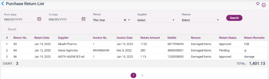 1. Purchase Return List: The return done from the purchases will be displayed in this report with return details, supplier details, invoice details, amount, status, and remarks.