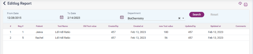 1. Edit Log Report: This report shows the list of lab reports in which the result value has been edited. The list displays the old value, the new value, the patient’s name, the test name, and the updated date.
